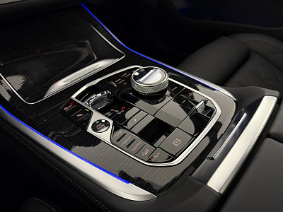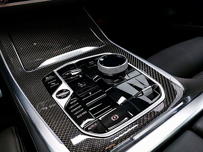 Стеклянная отделка деталей интерьера CraftedClarity: переключатель переключения передач с подсветкой символа "X", регулятор громкости, контроллер iDrive, кнопка Start/Stop