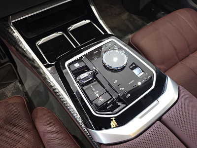 Стеклянная отделка деталей интерьера КрафтедКлэрити (CraftedClarity) для переключателя передач с подсветкой символа «Икс» ("X"), регулятора громкости, контроллера Ай-Драйв (iDrive) и кнопки Старт/Стоп (Start/Stop).