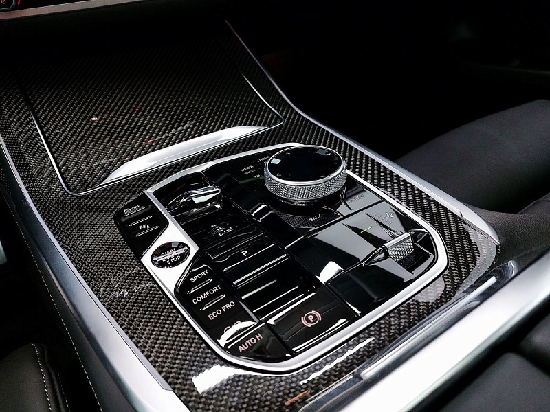 Стеклянная отделка деталей интерьера КрафтедКлэрити (CraftedClarity) для переключателя передач с подсветкой символа «Икс» ("X"), регулятора громкости, контроллера Ай-Драйв (iDrive) и кнопки Старт/Стоп (Start/Stop).