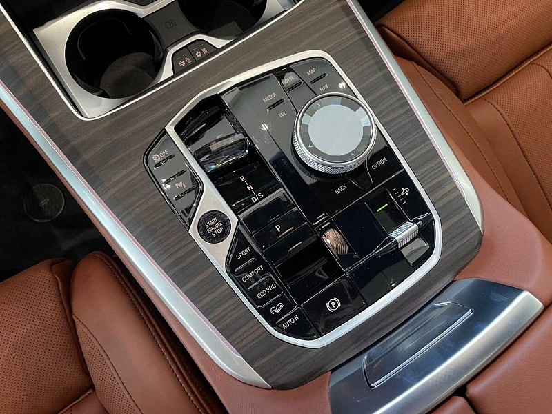 Стеклянная отделка деталей интерьера КрафтедКлэрити (CraftedClarity) для переключателя передач с подсветкой символа «Икс» ("X"), регулятора громкости, контроллера Ай-Драйв (iDrive) и кнопки Старт/Стоп (Start/Stop).