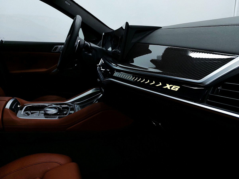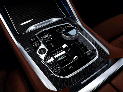 Стеклянная отделка деталей интерьера КрафтедКлэрити (CraftedClarity) для переключателя передач с подсветкой символа «Икс» ("X"), регулятора громкости, контроллера Ай-Драйв (iDrive) и кнопки Старт/Стоп (Start/Stop).