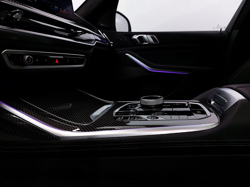Стеклянная отделка деталей интерьера КрафтедКлэрити (CraftedClarity) для переключателя передач с подсветкой символа «Икс» ("X"), регулятора громкости, контроллера Ай-Драйв (iDrive) и кнопки Старт/Стоп (Start/Stop).