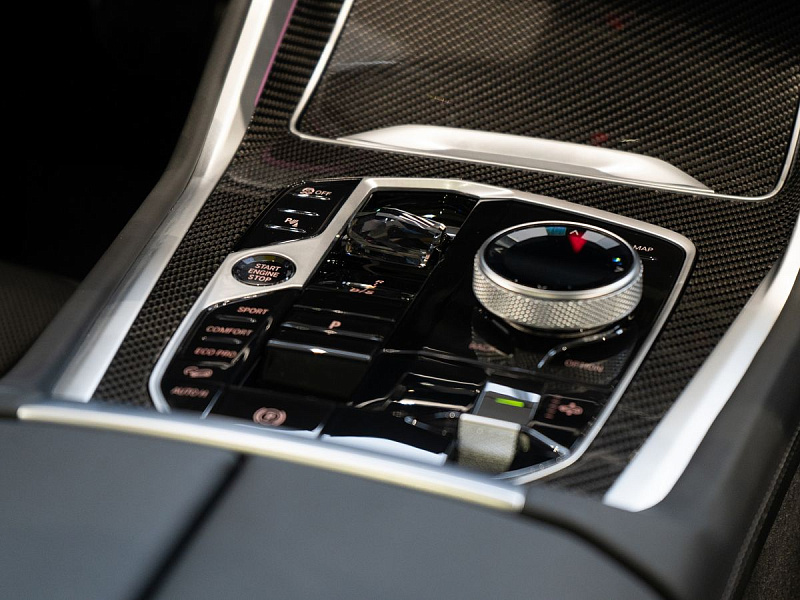 Стеклянная отделка деталей интерьера КрафтедКлэрити (CraftedClarity) для переключателя передач с подсветкой символа «Икс» ("X"), регулятора громкости, контроллера Ай-Драйв (iDrive) и кнопки Старт/Стоп (Start/Stop).