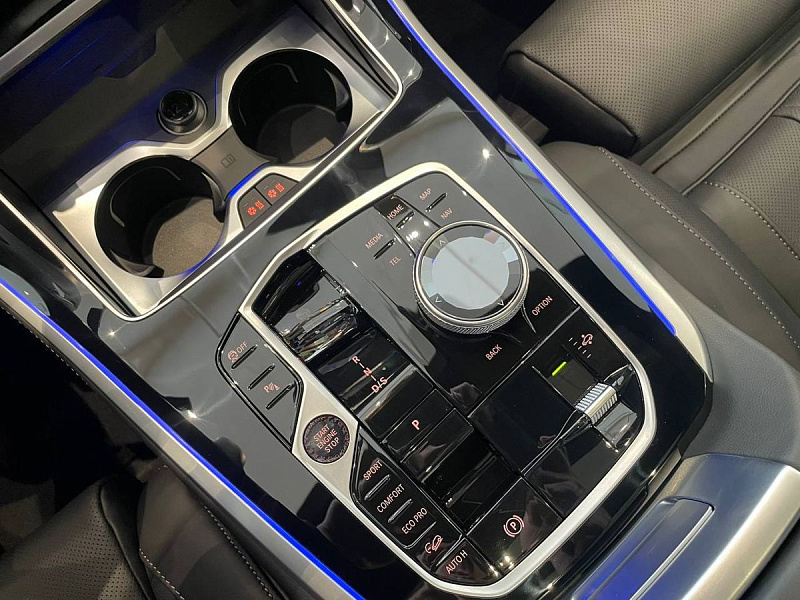 Стеклянная отделка деталей интерьера КрафтедКлэрити (CraftedClarity) для переключателя передач с подсветкой символа «Икс» ("X"), регулятора громкости, контроллера Ай-Драйв (iDrive) и кнопки Старт/Стоп (Start/Stop).