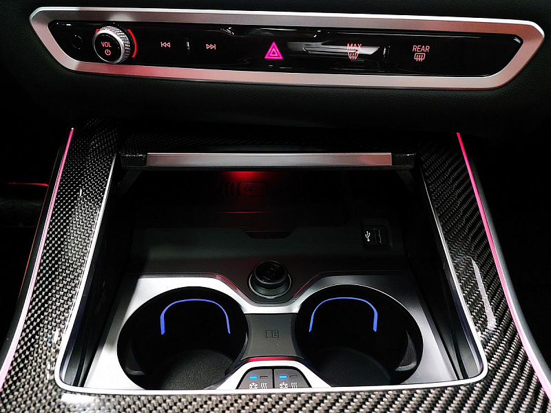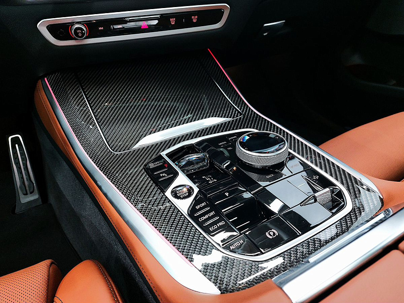 Стеклянная отделка деталей интерьера КрафтедКлэрити (CraftedClarity) для переключателя передач с подсветкой символа «Икс» ("X"), регулятора громкости, контроллера Ай-Драйв (iDrive) и кнопки Старт/Стоп (Start/Stop).